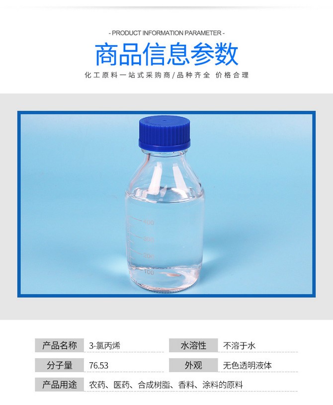 2.兼有烯烴和鹵代烴的反應性,是甘油、環(huán)氧氯丙烷、丙烯醇等的有機合成中間體。也用于農藥、醫(yī)藥的原料。還可用作合成樹脂、涂料、粘結劑、增塑劑、穩(wěn)定劑、表面活性劑、潤滑劑、土壤改良劑、香料等精細化學品的原料,主要用于制造環(huán)氧氯丙烷、甘油、氯丙醇、丙烯醇、農藥殺蟲雙、醫(yī)藥、樹脂、涂料、粘合劑,以及丙烯磺酸鈉,潤滑劑等。